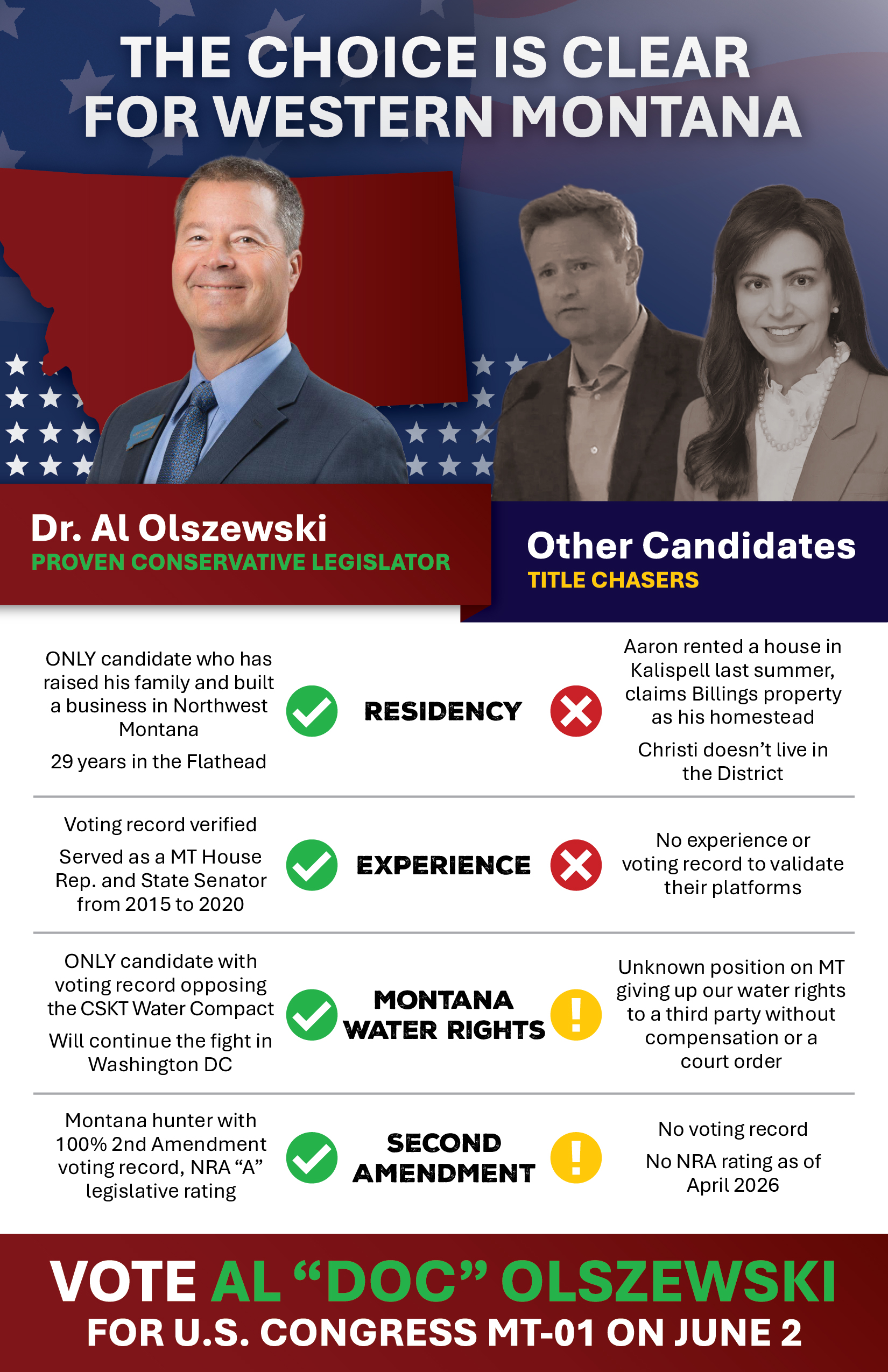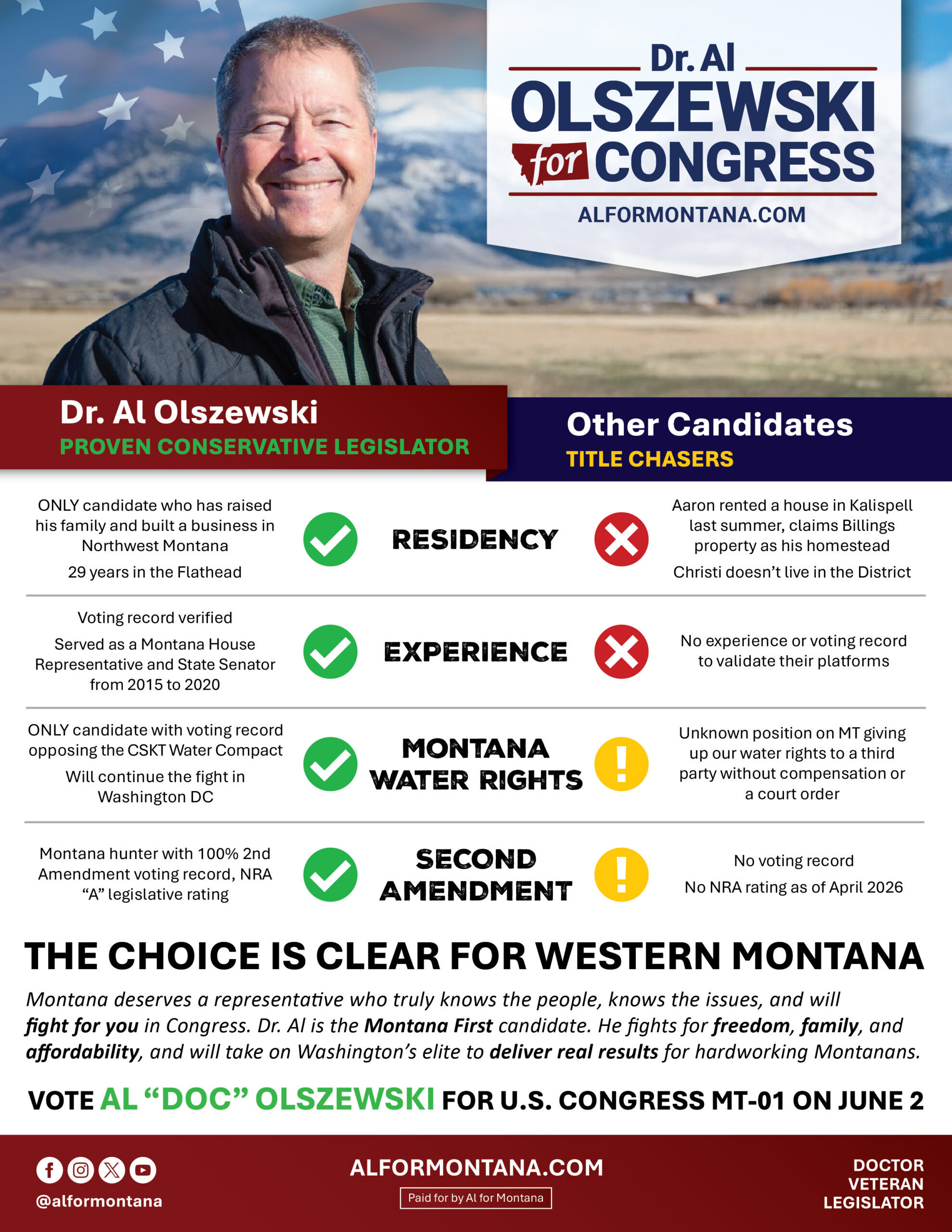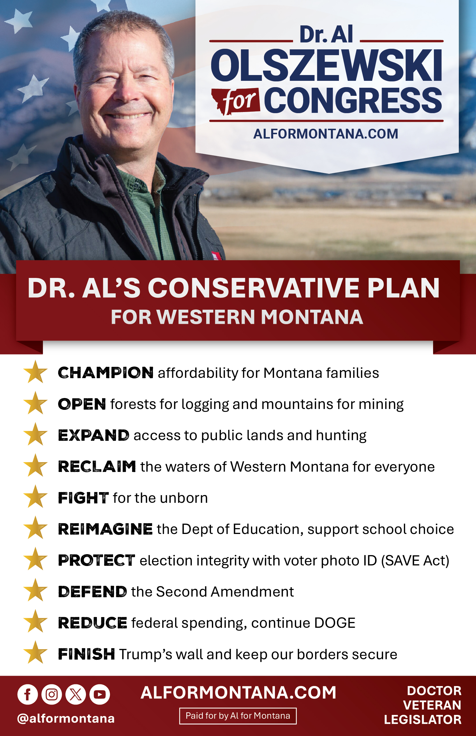 Download these tools today. Share them by emailing, texting, posting to social media, or printing at home. Tell your friends, family, and neighbors across Western Montana why Dr. Al is who we need to vote for in the Republican Primary on June 2.